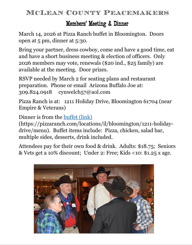 The McLean County Peacemakers held their annual banquet on Saturday, March 8, at the Pizza Ranch in Bloomington. Personally, I thought the fried chicken was better than the pizza, but there were mixed opinions about that.