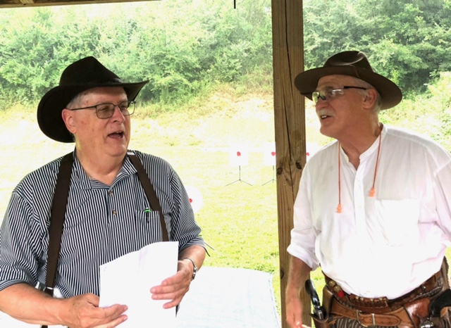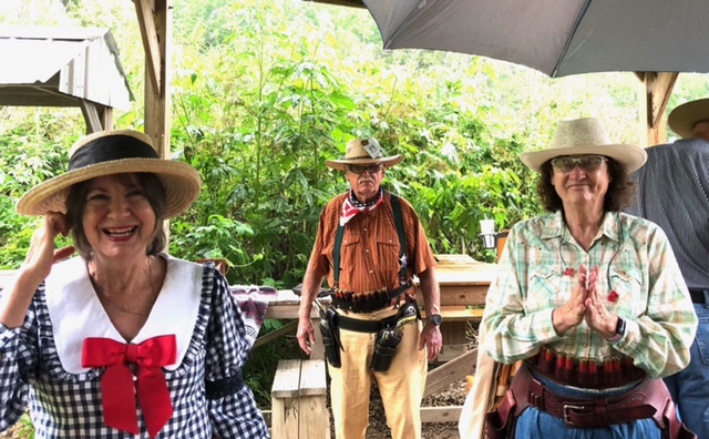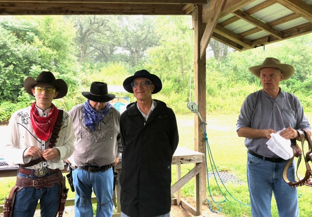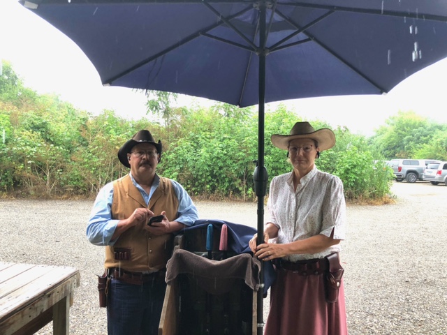 “Neither RAIN nor snow nor gloom of night shall keep the Peacemaker cowboys from making noise”. It rained steadily throughout the July match attended by 13 brave souls. Three stages were modified to use one bay with cover for the entire posse for all 5 stages. All the help doing take-down under soggy conditions is truly appreciated. Special thanks to Sheriff Boo Boo Bottom for timing the whole match.