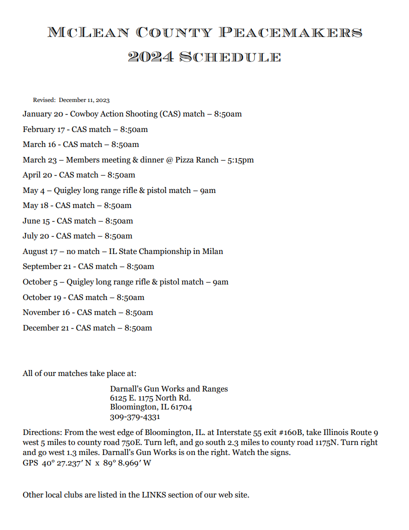 Events are held at Darnall’s Gun Works and Ranges. We hold matches once a month on the third Saturday (usually – check the schedule on the home page), all year long. We shoot 5 stages, even indoors in the winter.